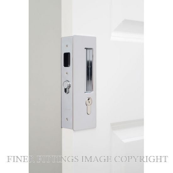 Raised shroud included as standard for increased security Key Locking hardware matches Passage and Privacy hardware Door slides flush back into the pocket Magnetic latch ensures door doesn’t roll away from the closing jamb Moving parts sit flush until the door closes to minimise wear Available in a range of finishes Suits doors from 33 - 40mm thick |