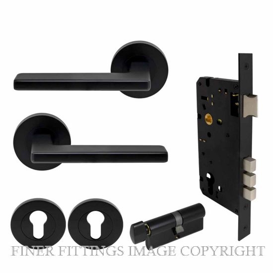 Set Euro Key & Turn Lock Kitset Keyed Alike Matt Black 57mm Round Rose Handles 60mm 32mm-50mm Stock Item Stock Item
